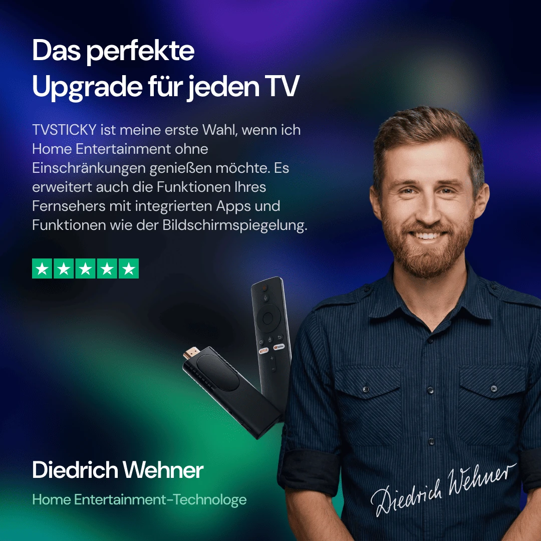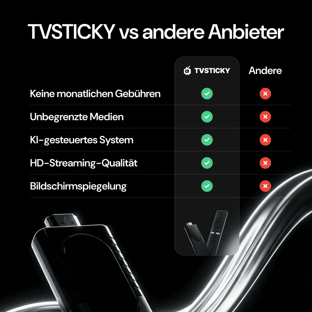 Meine Mission ist es, für Sie den besten Mehrwert zu finden. In einem überfüllten Markt für Smart-TV-Hardware sticht der TVSTICKY Media Extender klar hervor. Die Einrichtung ist echtes Plug-and-Play, bietet jedoch ein vollständiges Funktionspaket – von Dual-Band-WLAN bis zur Unterstützung von Dolby Atmos. Es ist das unverzichtbare Smart-TV-Upgrade-Modul für jedes moderne Wohnzimmer.